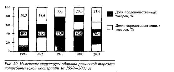 Существенной особенностью розничной торговли потребительской кооперации является обслуживание особого контингента потребителей — сельских жителей. За годы реформ значительно снизились доходы сельских жителей, соответственно снизилась покупательная способность населения. В структуре расходов сельских жителей стали преобладать расходы на продукты питания, которые превысили 40% от общей суммы расходов на конечное потребление. В условиях развития конкуренции потребительская кооперация потеряла значительную долю рынка за счет сокращения торговли в районных центрах, уступки самого выгодного сегмента сельского рынка предприятиям других организационно-правовых форм. Повсеместно уменьшилось количество магазинов, торгующих непродовольственными товарами. Рассмотренные факторы способствовали изменению структуры оборота розничной торговли потребительской кооперации, в которой стали преобладать продовольственные товары.