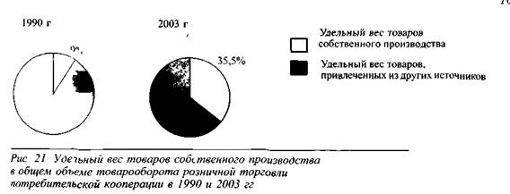 Потребительская кооперация занимается сельским хозяйством, заготовками сельскохозяйственной продукции и сырья, производством продовольственных товаров на промышленных предприятиях. Эти отрасли являются поставщиками товаров для розничной торговли потребительской кооперации. За годы реформ удельный вес товаров собственного производства в общем объеме то-варооборота розничной торговли потребительской кооперации возрос с 9 до 35,5% (рис. 21).