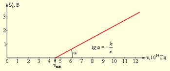 | Величина Uз не зависит от интенсивности падающего светового потока. Тщательные измерения показали, что запирающий потенциал линейно возрастает с увеличением частоты ν света. |