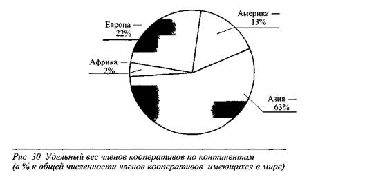 До 60-х гг. XX в. самым массовым было кооперативное движение Европы. Однако в настоящее время центр кооперативного движения переместился в Азию. Общее количество членов кооперативов, имеющихся в мире, распределяется по континентам следующим образом: Азия — 63%, Европа — 22%, Америка — 13%, Африка — 2% (рис. 30).