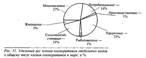 Из рисунка 31 видно, что наибольшее распространение в мире получили кредитные кооперативы. Кредитные кооперативы востребованы во всех странах, особенно в странах с развитой рыночной экономикой. Это объясняется тем, что в этих странах сформировалась для них социальная база: их членами являются предприятия малого и среднего предпринимательства, для которого кредитная кооперация — кровеносная система.