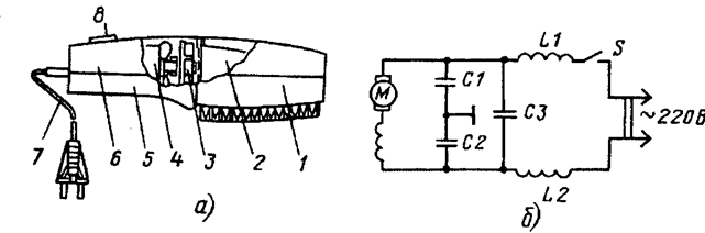 М – электродвигатель; С1, C2 - конденсаторы емкостью по 4700 пФ; СЗ - конденсатор емкостью 0,25 мкФ; L1, L2 - высокочастотные дроссели; S – выключатель.