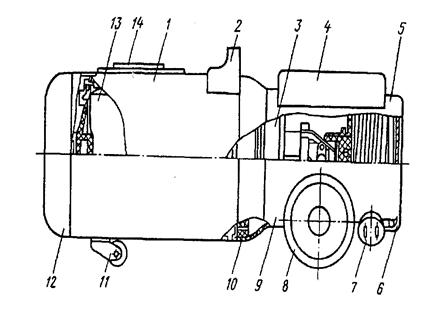 Воздуховсасывающий агрегат 14 закреплен между крышкой и металлическим кожухом 6 при помощи винтов. Резиновый уплотнитель 5 является амортизатором. Крышка и корпус соединяются двумя замками. Крышка пылесборника 10 и корпус соединяются винтом 3, между ними расположен резиновый уплотнитель с пылефильтром 1. На крышке имеются: выключатель 12, гнездо подключения пылесоса к электросети с помощью сетевого шнура и отверстие 15 выхода воздуха. На боковой стенке корпуса расположено вводное отверстие 11, служащее для присоединения шланга-воздухопровода к пылесосу.