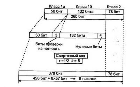 В кодере канала 260 бит информации разделяются на 2 класса: