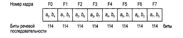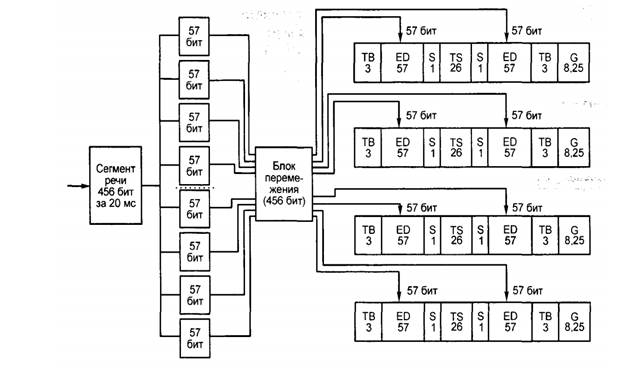 После перемежения 456бит одного речевого сегмента распределяются по одноименным слотам (временной интервал) 4х последовательных кадров канала трафика.