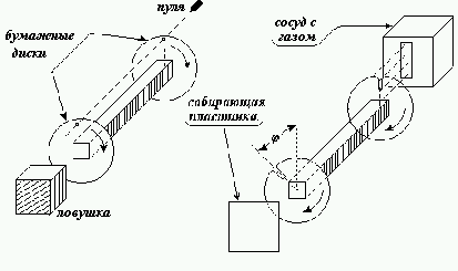 В отсутствии внешних сил молекулы газа в промежутке времени между соударениями движутся свободно, их скорости практически не изменяются, так как на больших расстояниях силы взаимодействия чрезвычайно малы. Каким способом можно было бы измерить скорости молекул? Ответ на этот вопрос подсказывает решение одной экспериментальной задачи механики. Для измерения скорости пули, выпущенной из ружья, используют два соосных, вращающихся с одной и той же постоянной угловой скоростью w бумажных диска (см. лабораторную работу в курсе механики). Пуля пробивает оба диска и застревает в ловушке. За время пролета пули Dt от одного до другого диска они поворачиваются на угол j=wDt. Измерение угла поворота дает время пролета. Таким образом, скорость пули определится как v =L/Dt=Lw/j, где L - заданное расстояние между дисками.
