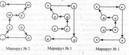 Пусть требуется зашифровать исходный текст Т0 = <МЕТОДЫ_ПЕРЕСТАНОВКИ>. Ключ и длина зашифрованных блоков соответственно равны: К=<2,1,1>, L=4. Для шифрования используются таблица и два маршрута, представленные на рис.11.5. Для заданных условий маршруты с заполненными матрицами имеют вид, показанный на рис.11.6.