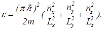 Рассмотрим теперь состояние идеального газа с квантовой точки зрения. Пусть частица массы m находится в непроницаемом ящике размером Lx´Ly´Lz. Ее энергия равна