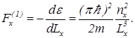 Формула (22) показывает, что энергия любого уровня зависит от размеров ящика. Допустим, одну из стенок ящика (например, перпендикулярную оси OX) заменили поршнем. При уменьшении объема ящика поршнем энергия частицы будет увеличиваться. Значит, чтобы сжать область под поршнем надо совершить работу против силы давления частицы на стенку. Эта сила равна минус производной от энергии по размеру Lx: