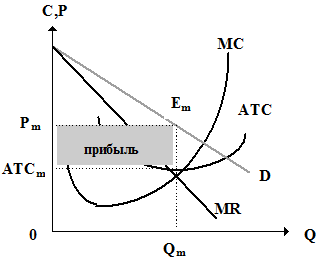 Равновесие монополиста интерпретируется точкой Еm. При Qm фирма - монополист максимизирует прибыль. Продукция реализуется по цене Pm. Поскольку в данном случае ATCm < Pm , то прибыль, исчисленная по формуле Pr = (P m - ATC m) * Q m принимает положительные значения.