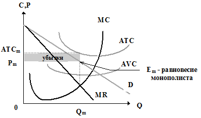 Это может произойти в случае, если соотношение между рыночной ценой и издержками в точке равновесия описывается неравенством: AVCm < Pm < ATCm. Если монополист не будет осуществлять предложение в этих условиях и прекратит производство, его убытки будут больше на величину (Pm - AVCm) * Qm. Таким образом, фирма - монополист минимизирует убытки, производя в краткосрочном периоде объем Qm.
