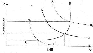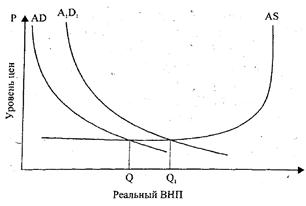 Кейнсианская школа полагает, что экономика развивается не так гладко, а заработная плата, цены и процентная ставка настолько гибки, что могут привести к соответствию спроса и предложения на макроэкономическом уровне (рисунок 9.5). Где: AD - совокупный спрос на исходном уровне;
