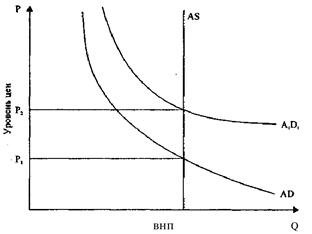 На вертикальном отрезке сдвиг кривой совокупного спроса сопровождается только ростом цен (инфляцией спроса), реальный ВНП не изменяется. Если совокупный спрос увеличится, цены возрастут, а реальный объем производства останется неизменным.