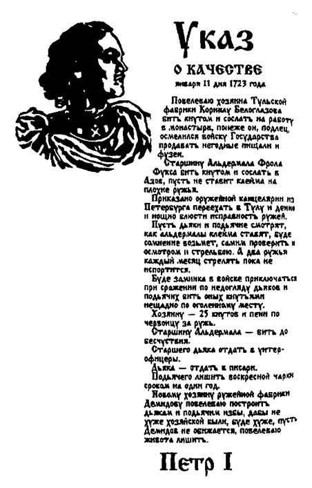 В контексте рассматриваемого вопроса об управлении качеством несомненный интерес представляет Указ Петра I о качестве от 11 января 1723 года (рис. 5). Из текста Указа ясны не только требования Государя к качеству продукции (в данном случае - ружья для армии), но и к системе контроля качества, государственного надзора за ним и меры наказания за выпуск дефектной продукции.