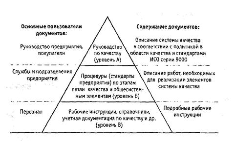 Верхнюю часть пирамиды занимает руководство (справочник) по качеству для всей фирмы, которое содержит сформированную директиву/политики фирмы в области качества, цели по качеству и утвержденную организационную структуру производства. Среднюю часть пирамиды составляют методические документы общего характера, мероприятия и последовательность операций по обеспечению качества. Нижняя часть пирамиды - это набор рабочих инструкций для исполнителей.