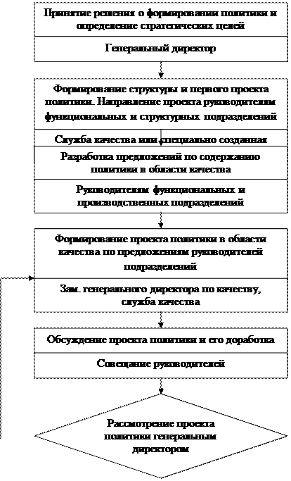Руководство предприятия должно принимать все необходимые меры, обеспечивающие понимание этой политики, ее неуклонное проведение всеми работниками предприятия. В отсутствие четкой и документально оформленной политики деятельность предприятия в области качества неопределенна и случайна. Поэтому формирование и документальное оформление руководством предприятия политики в области качества является первичным при создании системы качества на предприятии (рис. 12).