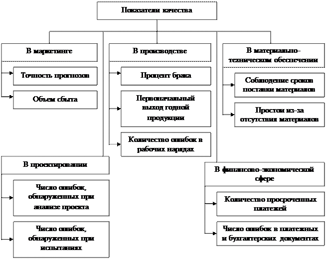 Планирование качества представляет собой деятельность, устанавливающую цели и требования к качеству и применению отдельных составляющих систем качества. При этом предполагается определение конкретных показателей качества по всем направлениям деятельности фирмы (примеры таких показателей приведены на рис. 15).