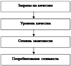 Вышесказанное определяет взаимосвязь понятий «качество», «полезность», «потребительная стоимость». При этом качество выражает не просто полезность объекта, а степень его полезности. То есть получается цепочка (рис. 27), в которой затраты на качество определяют его уровень, а уровень качества определяет степень полезности объекта, непосредственно реализованной в потребительной стоимости.