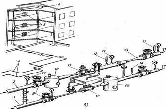 Узел управления 3 выполняют в виде насосных (рисунок 2.1, б) или элеваторных (рисунок 2.1, в) узлов. Сеть трубопроводов системы отопления (рис. 2), выполняемая из стальных водощзопроводных труб, состоит из подающих, обратных (магистральных) трубопроводов 2, стояков 3, подводок 4 к отопительным приборам 5.