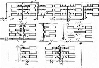 Сети выполняют двухтрубными с верхней (рис. 2.2, а) и нижней (рис. 2.2., б) разводкой; однотрубными вертикальными с замыкающими участками и трехходовыми кранами с нижней (рис. 2.2, в) и верхней (рисунок 2.2, г) разводкой; однотрубными вертикальными проточными (рисунок 2.2, д). Чтобы обеспечить лучшие условия затекания воды в прибор и тем самым повысить эффективность его теплопередачи в однотрубных вертикальных сетях применяют подводки 4 со смещенными перемычками (рисунок 2.2, е, ж).