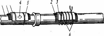 / — труба; 2 — прокладка; 3 — пластина; 4 — отверстие; 5 — хомут; 6 — проволока