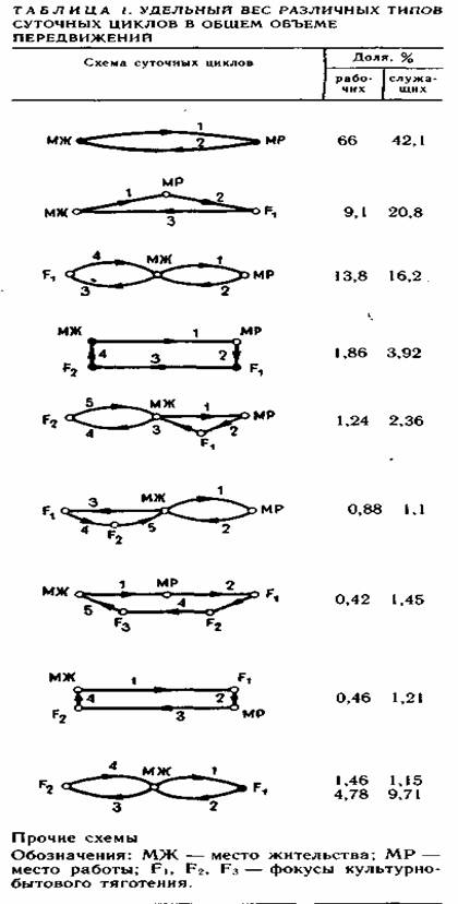 Так, например, по данным обследований в течение суток каждые 1000 жителей Москвы совершают следующее число передвижений к различным объектам притяжения: на работу—466; к месту учебы—120; в театры—17; на стадионы—8; в кинотеатры и клубы —72; в другие культурно-просветительные учреждения —35; парки, скверы —93; для занятий спортом —8; на рынки —70; в центральные магазины промтоварные —98; в районные промтоварные магазины—195; в продовольственные магазины—681; в больницы и другие лечебные учреждения—91; в дошкольные учреждения —66; в столовые, рестораны, кафе—107; к объектам бытового обслуживания —37; в гости —88; за город —44; прогулки —252; возвращение домой — 464.