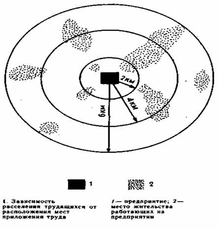 Зависимость расселения трудящихся от мест приложения труда может быть выражена графиком.