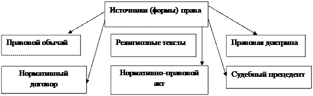 судебная практика, религиозные нормы, обычаи; но постепенно, в связи с укреплением государственных начал в управлении обществом, в качестве основной формы права был установлен нормативно-правовой акт (законодательство).