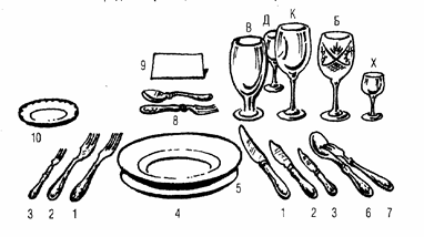 1 - столовый прибор; 2 - рыбный прибор; 3 - закусочный прибор; 4,5 - подставочная тарелка, и на ней стоит закусочная тарелка; 6 - столовая ложка, и на ней лежит вилка для устриц (7). Единственная вилка, которая может находиться справа от тарелки - это вилка для устриц, либо, в случае, когда вместо рыбного ножа подают вторую вилку, - рыбная вилка. В верхней части рисунка (над тарелкой) расположены: 8 - десертный прибор; 9 - банкетная карточка и 10 -хлебная тарелка.Показано обычное количество бокалов для официального обеда: В - бокал для воды; К- бокал для красного вина; Б - бокал для белого вина; X - бокал для хереса и Д - бокал для десертного вина.