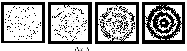 При малой экспозиции на пленке отпечатываются отдельные хаотически разбросанные точки - зачерненные зерна, в которые попал один или несколько фотонов. Никакого порядка в распределении их нельзя рассмотреть. Однако, если наложить друг на друга несколько таких фотопластинок, или сделать время экспозиции в несколько раз большим, то в более плотном распределении точек начинает проглядывать закономерность - дифракционная картина. При длительной экспозиции на фотопластинке все лучше видна картина дифракции на круглом отверстии. На рисунке запечатлена последовательность изображений фотопластинок с отпечатками все большей экспозиции.