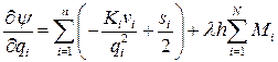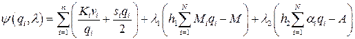 Если нужно найти минимальные издержки (9.5), при ограниченных на складские площади (9.7) и на оборотные средства (9.11), вложенные в запасы, то составляется функция Лагранжа вида: