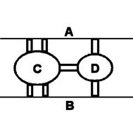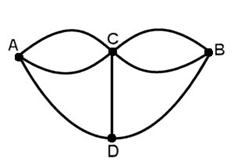 Л. Эйлер (в возрасте 20 лет) доказал невозможность построить такой маршрут. Для решения задачи Л. Эйлер обозначил каждую часть суши точкой. Поскольку связи между частями суши поддерживаются только через 7 мостов, то каждый из них изображался линией (ребром), соединяющей соответствующие части суши (вершины). В результате получалась схема, состоящая из точек А, В, С, Д (вершин) и соединяющих их линий (ребер) (рис. 10.2).