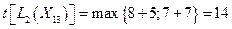 Согласно принципу оптимальности Беллмана, оптимальное управление на каждом этапе определяется целью управления и состоянием на начало этапа. Состояние системы – это события, лежащие на рангах. Для совершения конечного события Х16 необходимо совершение предшествующих событий. Возможные состояния системы на начало последнего этапа работ – совершение событий Х14 и Х15. В кружках у точек Х14 и Х15 поставим максимальную продолжительность работ на последнем этапе: Х14 5, Х15 7. Найдем максимальную продолжительность работ на двух последних этапах. Состояние системы на начало предпоследнего этапа обусловлено событием Х13. Максимальная продолжительность пути, ведущая из Х13 к Х16 равна