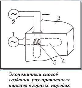 В ИГТМ предложен оригинальный способ разрушения горных пород путем облучения двумя генераторами СВЧ [9]. Сначала массив породы облучают волнами меньшей энергетической плотности (150_300 Вт/см2) от генератора 1 до образования теплового следа, а затем - волнами большей плотности (300_5000 Вт/см2) от генератора 2, идущими в перпендикулярном направлении. Первое облучение создает в породе 3 нагретую зону 4 с повышенным значением мнимой составляющей диэлектрической проницаемости.
