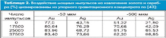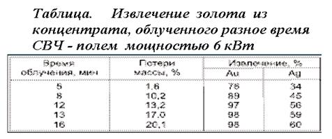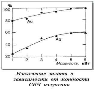 Другой опыт: 100 г концентрата облучали мощностью 6 кВт в разное время - от 5 до 16 мин (табл.). Здесь 98% золота и 60% серебра извлекалось после обработки в течение 13 - 16 минут. Хотя режим обработки не был отработан, необходимое для извлечения время СВЧ - нагрева оказалось много меньше, чем при обычном нагреве (2-2,5 ч). Достоинство СВЧ - метода состоит в возможности использовать более крупные частицы породы - до 2 мм.