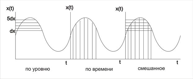СМЕШАННЫЙ. При нем непрерывный сигнал превращается в дискретную форму через равные промежутки времени dt, но при этом выделяется ближайший уровень квантованного сигнала. Такие системы называются цифровыми. Наиболее распространены в АСУ и обработке информации, осуществляются с помощью ЭВМ