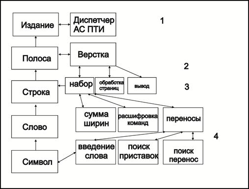 На приведенном рисунке показаны взаимосвязи между программными и информационными уровнями. Для упрощения схемы в нее включена только одна подсистема верстки. Аналогичными подсистемами, не указанными в данной схеме являются подсистема ввода, корректуры и вывода. При создании программного обеспечения, его удобно конструировать из отдельных программных модулей. Модулем считается совокупность команд, предназначенных для реализации отдельной логически завершенной функции.