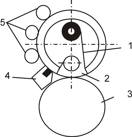Где 1 – рулонный формный материал, 2 – формный цилиндр, 3 – офсетный цилиндр, 4 – устройство удаления остатков формного материала, 5 – валики красочного аппарата.
