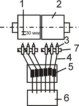 Данная линейка располагается вдоль образующей формного цилиндра 2 (параллельно ей). Каждый модуль содержит инфракрасный лазерный диод 5 мощность 1 Вт, световод 4 и фокусирующую оптику 3. Оптика фокусируется так, что на печатной бумаге образуется точечный печатный элемент 1, диаметр минимальный которого 30 мкм, что позволяет получить разрешение 1270 дпи. цифровые сигналы об изображении от компьютера поступают а контроллер 6, который управляет модуляцией лазерных диодов 5. Модули лазерных диодов закреплены на линейке 7 и распределены вдоль формного цилиндра 2 через равные расстояния. Запись по оси х осуществляется за счет возвратно-поступательного движения линейки. Размер шага этого движения определяется разрешением записи, а по оси у за счет частоты вращения формного цилиндра. Для экспонирования пластины форматом 460х340 мм с разрешением 1270 дпи уходит 6 минут.