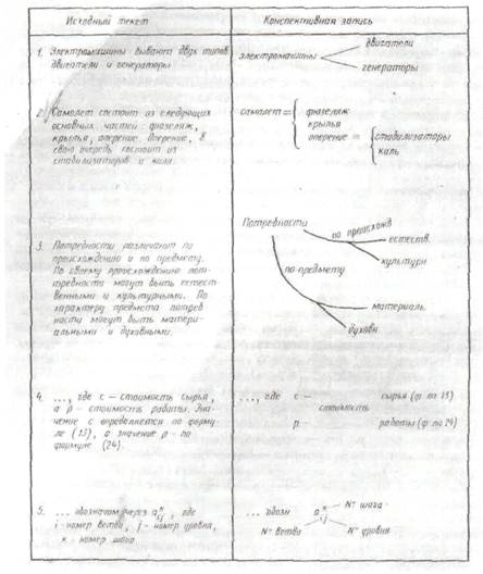 Удобен этот способ и для чтения конспекта. Обратите внимание на пример 4. В исходном тексте обозначения с и р занимали разные позиции в строках, поэтому их трудно было найти. Выяснить формулу, по которой их надо считать, это также отдельная мыслительная работа. В конспективной записи обозначения и их расшифровки выстроились в некое подобие таблицы и потому нужное обозначение легко найти. Аналогичный эффект еще в большей степени имеется и в последнем примере. Предположим, что где-то дальше нам при чтении встретилось обозначение атпа и, забыв, что какой индекс обозначает, мы обращаемся к описанию а*.