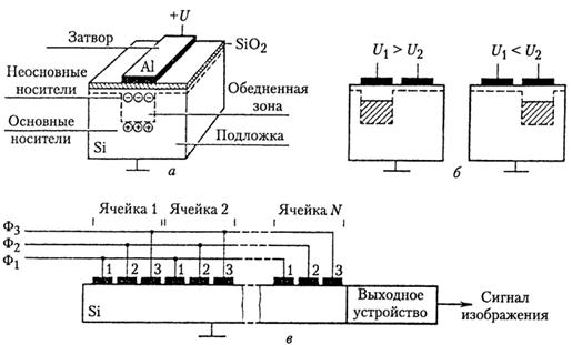 Воздействие света приводит к появлению электронно-дырочных пар и накоплению неосновных носителей (электронов) в потенциальной яме. Накопленный заряд пропорционален освещенности и времени накопления. Направленная передача накопленных зарядов в ПЗС от одного МОП-конденсатора к близко расположенному соседнему производится продольным электрическим полем между затворами при подаче на второй затвор более высокого напряжения. Под этим электродом образуется более глубокая потенциальная яма, в которую перетекает зарядовый пакет. Этот процесс иллюстрируется рис. 5.1. б, на котором штриховкой показана степень заполнения потенциальной ямы неосновными носителями, т.е. величина заряда под электродом.