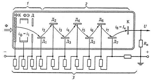 Электронно-оптическая секция помимо ФК содержит фокусирующий электрод (ФЭ), диафрагму Д и первый динод Д1 (эмиттер вторичных электронов). Фотоэлектроны покидают ФК под различными углами к его поверхности и с различными скоростями. Электроды ФК, ФЭ. Д и Д1 образуют электростатические линзы, обеспечивающие фокусировку и ускорение фотоэлектронов, направляемых на первый динод Д1. Секция вторично-электронного умножения 2 состоит из нескольких динодов и коллектора К. Между соседними динодами приложены ускоряющие напряжения, снимаемые с делителя 3. Фотоэлектроны, попадая на первый динод Д1, вызывают вторично-электронную эмиссию. Значение коэффициента вторичной эмиссии