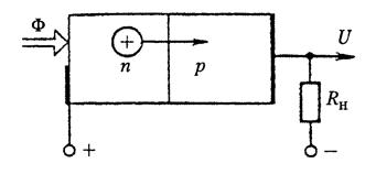 Фотодиоды - полупроводниковые приборы с диффузионным переходом, работа которых основана на внутреннем фотоэффекте. На фотодиод подается запирающее напряжение (обратное смещение). По принципу действия фотодиод аналогичен запертому полупроводниковому диоду, обратный ток которого изменяется под действием светового потока Ф (рис. 5.3). Применяются кремниевые фотодиоды, имеющие квантовый выход около 75% и примерно равномерную спектральную чувствительность в диапазоне 400-1100 нм. Световая характеристика мало зависит от приложенного напряжения и линейна. Рабочее напряжение около 20 В, темновой ток 1-2 мкА, интегральная чувствительность 3 мА/лм. Кремниевые фотодиоды обладают малой инерционностью, не зависящей от светового потока.