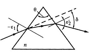 Двугранный угол, образованный рабочими гранями трехгранной призмы, т.е. такими гранями, на которых происходит преломление, называется преломляющим углом призмы и обозначается