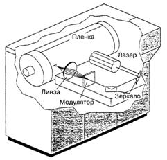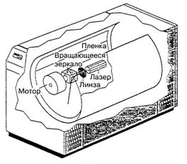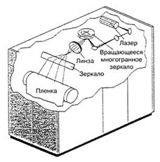 Фотоматериал располагается в плоскости и перемещается (непрерывно или дискретно), осуществляя развертку изображения по вертикали. Горизонтальная развертка изображения производится непрерывно вращающимся многогранным, а иногда качающимся одногранным, зеркальным дефлектором. Фотонаборные автоматы, построенные по этой схеме, называют автоматами ролевого или капстанового (англ. capstan - вал) типа (рис. 9.1).