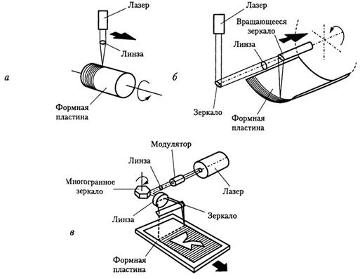 В современных системах CtP, ориентированных на изготовление офсетных и фотополимерных форм высокой и флексографской печати, применяют лазерные рекордеры трех основных типов (рис. 16.1):