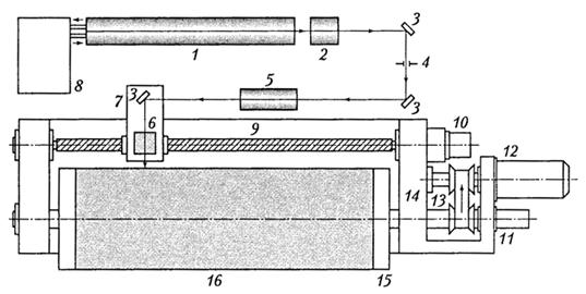 На рис. 16.3 приведена конструкция лазерного сканирующего устройства рекордера с однолучевой записью формной пластины. Устройство работает следующим образом. Формная пластина J 6 закрепляется на барабане 15, который установлен на станине 14, и вращается электродвигателем постоянного тока 12 через механизм привода J 3. На одном валу с барабаном 15 расположен оптоэлектронный преобразователь угловых перемещений в цифровой код 11. Вдоль образующей барабана на станине установлены ходовой винт 9, на валу которого расположен шаговый электродвигатель 10. При работе шагового электродвигателя J 0 ходовой винт 9 вращается и за счет этого каретка 7 с записывающей головкой, содержащей фокусирующую линзу 6 и зеркало 3 перемещается вдоль образующей барабана. В качестве источника излучения используется твердотельный YAG-лазер 1, работающий в ИК-диапазоне спектра на длине волны 1,064 нм с выходной мощностью 15-20 Вт и оснащенный системой охлаждения 8. Лазерный луч модулируется акустооптическим модулятором 2 и далее через систему зеркал 3, диафрагму 4, телескоп 5 попадает в линзу 6, которая фокусирует его в пятно малого размера на поверхности формной пластины, закрепленной на вращающемся барабане 15. Развертка по строке осуществляется вращением барабана и контролируется оптоэлектрон-ным преобразователем угловых перемещений 11, а развертка по кадру - вращением (с помощью шагового электродвигателя 10) прецизионного ходового винта 9, по которому движется каретка /записывающей головки.