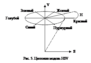 В модели HSV (рис. 5) цвет описывается следующими параметрами: цветовой тон H (Hue), насыщенность S (Saturation), яркость, светлота V(Value). Значение H измеряется в градусах от 0 до 360, поскольку здесь цвета радуги располагаются по кругу в таком порядке: красный, оранжевый, желтый, зеленый, голубой, синий, фиолетовый. Значения S и V находятся в диапазоне (0…1).