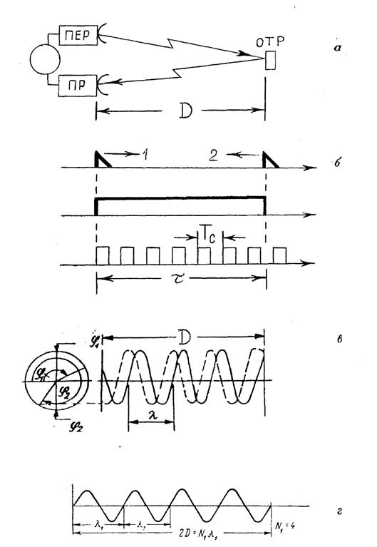 Принцип работы светодальномеров базируется на определении времени τ распределения электромагнитных волн видимого или инфракрасного излучения вдоль измеряемого расстояния 13 (рис. 49,а), на одном конце которого установлен приемо-передатчик ПР-ПЕР, а на другом – светоотражатель ОТР. Поскольку световые сигналы проходят двойное расстояние 2D, то