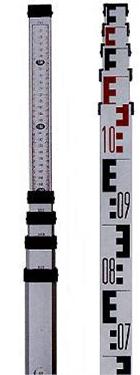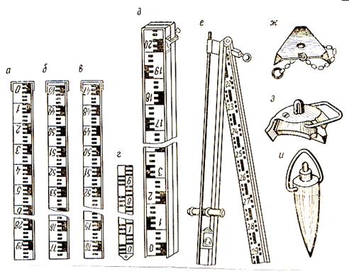 В зависимости от точности нивелирования применяют штриховые рейки с инварной полосой и круглым уровнем, односторонние, имеющие основную и дополнительную шкалы (РН-05) и шашечные рейки. Комплект штриховых реек состоит из двух трехметровых реек (по 6 кг каждая) и подвесной реечки длиной 1,2 метра. Шашечные рейки изготавливают длиной от 1,5 до 4 – х метров, они бывают складные и нескладные (рис. 57, д). Каждое деление рейки, затененное и белое равно 10 мм, они образуют дециметровые деления, подписанные на рейке. Для нивелирования кроме нивелира и реек используют металлический «башмак» с целью временного закрепления точки для установки рейки.